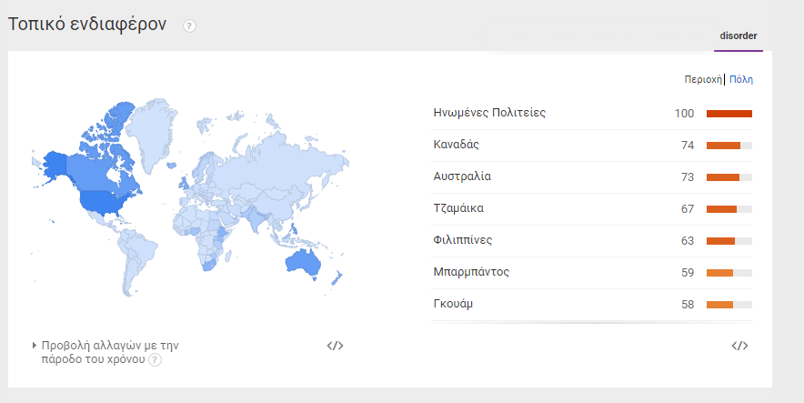 Η αναζήτηση ψυχολογικών όρων στο Google Trends μας δείχνει τις τάσεις στος όρους αναζήτησεις που αφορούν την ψυχική μας υγεία. Όπως προκύπτει απο το παρακάτω γράφημα, στην Ελλάδα απο το 2009 έως σήμερα έχουν αυξηθεί οι αναζητήσεις για τους όρους άγχος, ψυχίατρος και διαταραχή, μικρή μείωση παρουσιάζει η αναζήτηση με τον όρο ψυχολόγος και σχετικά στάσιμη παρουσιάζεται η αναζήτηση με τον όρο κατάθλιψη. Άτομα που αναζητούν πληροφορίες για το άγχος αλλά και τις κρίσεις πανικού, χρησιμοποιούν συνοδευτικά τους όρους συμπτώματα κάτι που δείχνει ότι θέλουν να κάνουν διάγνωση στον εαυτό τους και ακολουθεί ο όρος αντιμετώπιση. Ο όρος διαταραχή αναζητείται περισσότερο για την διπολική διαταραχή, την ιδεοψυχαναγκαστική διαταραχή, την διαταραχή της προσωπικότητας, την αγχώδη και την ψυχαναγκαστική διαταραχή. Ο όρος ψυχίατρος συνδυάζεται περισσότερο με συγκεκριμένες περιοχές διαμονής, ενώ ενδιαφέρον παρουσιάζει η συσχέτιση της αύξησης αναζήτησής του, με την μείωση στον όρο ψυχολόγος, κάτι που αντανακλά το γεγονός ότι οι περισσότεροι καταφεύγουν σε φαρμακευτική αγωγή και όχι ψυχολογική υποστήριξη για την αντιμετώπιση των ψυχολογικών προβλημάτων τους.